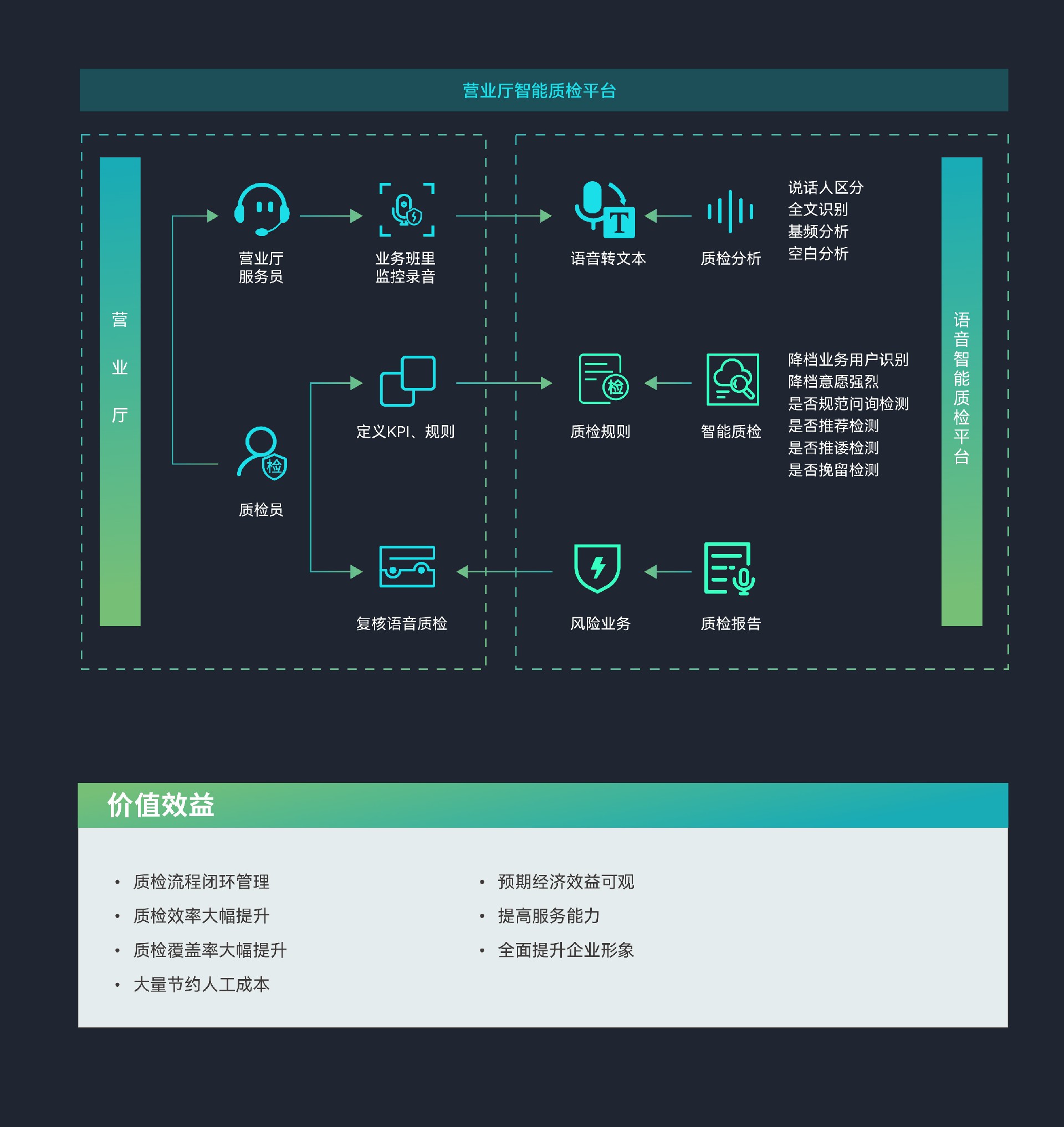 营业厅智能质检解决方案通过应用NLP(自然语言处理)技术和语音转写引擎,将营业厅现场的录音高效转写为文本数据, 进而对这些数据进行深入的分析处理。该方案旨在全面检测营业员与用户之间的交互过程,从而精准识别服务中存在的问 题,为提升营业员的服务水平提供有针对性的改进建议。